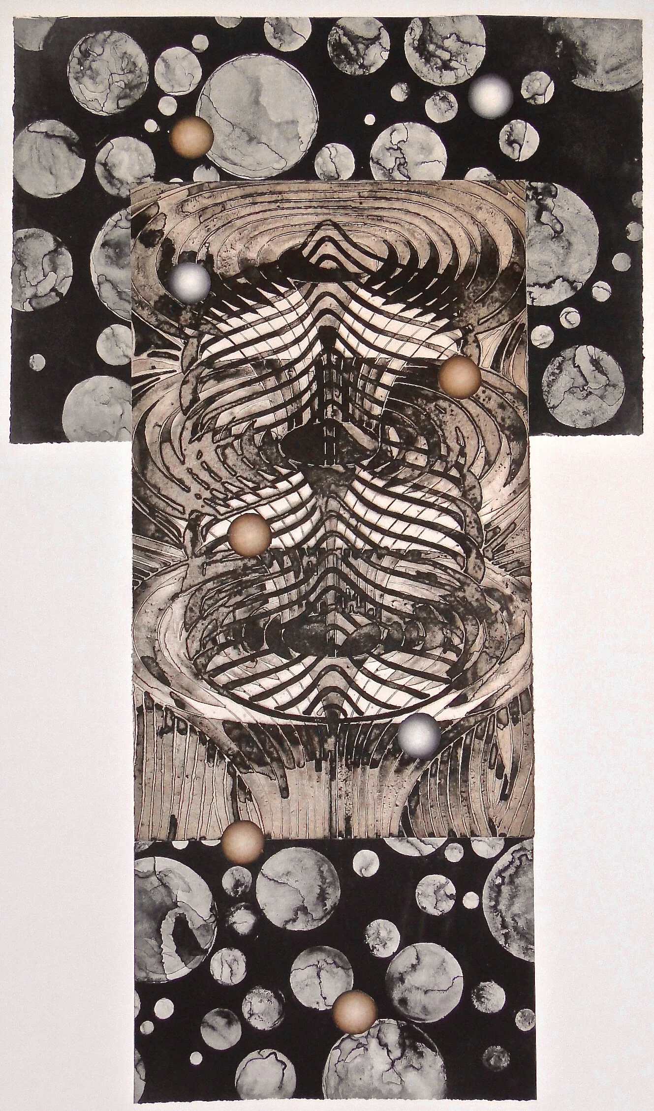 STEVEN SORMAN, “time’s measure,” 2017, photopolymer intaglio monoprint with collage, 36” x 21 3/4”