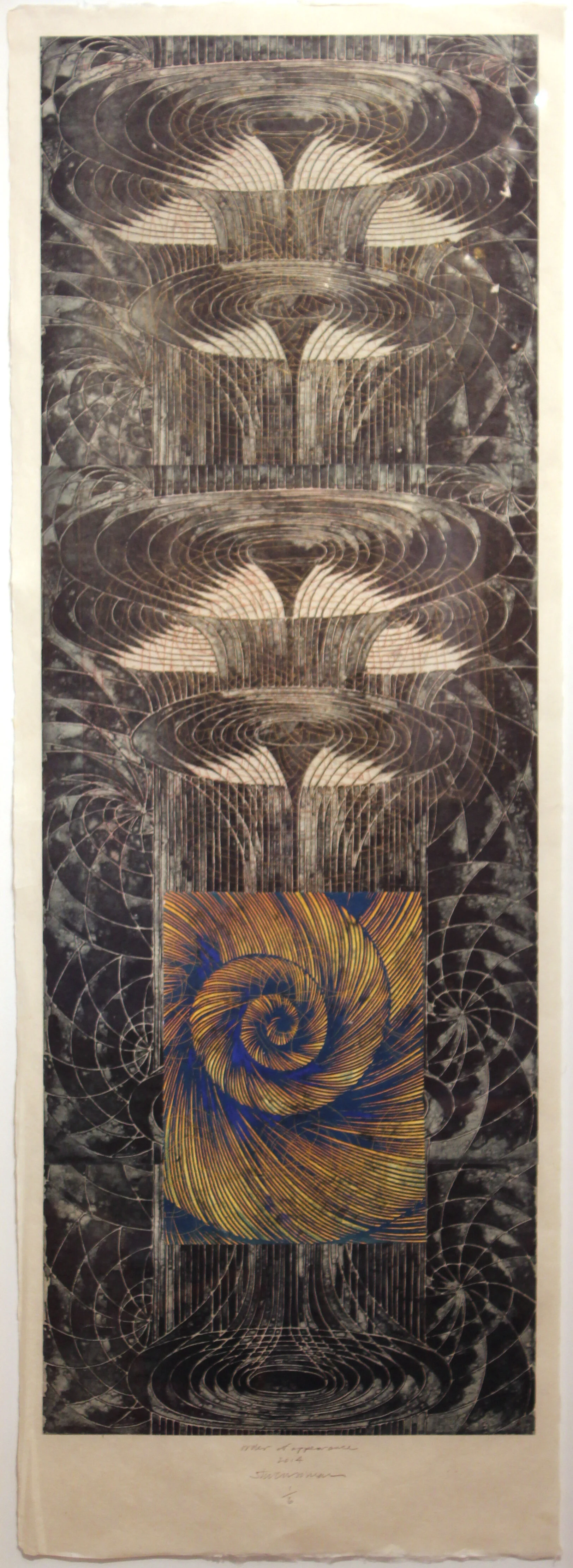 STEVEN SORMAN, “fountain for David/fountain from David,” 2014, photopolymer intaglio, etching, gesso, on Whatman and Bodleian papers, ed 4/10, 39 7/8” x 20” (framed)