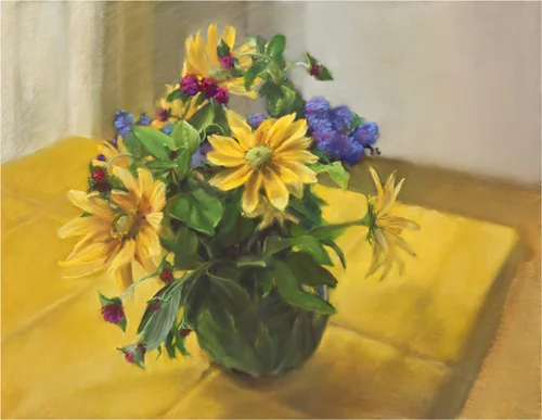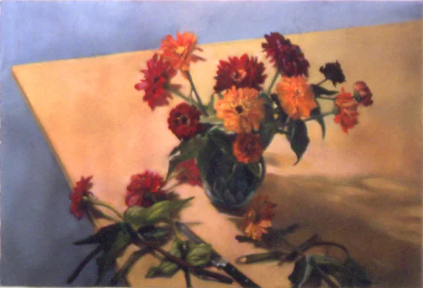Mary Joan Waid (BIO), Zinnias, 1996, pastel on paper, 41 1/4" x 55 3/8"