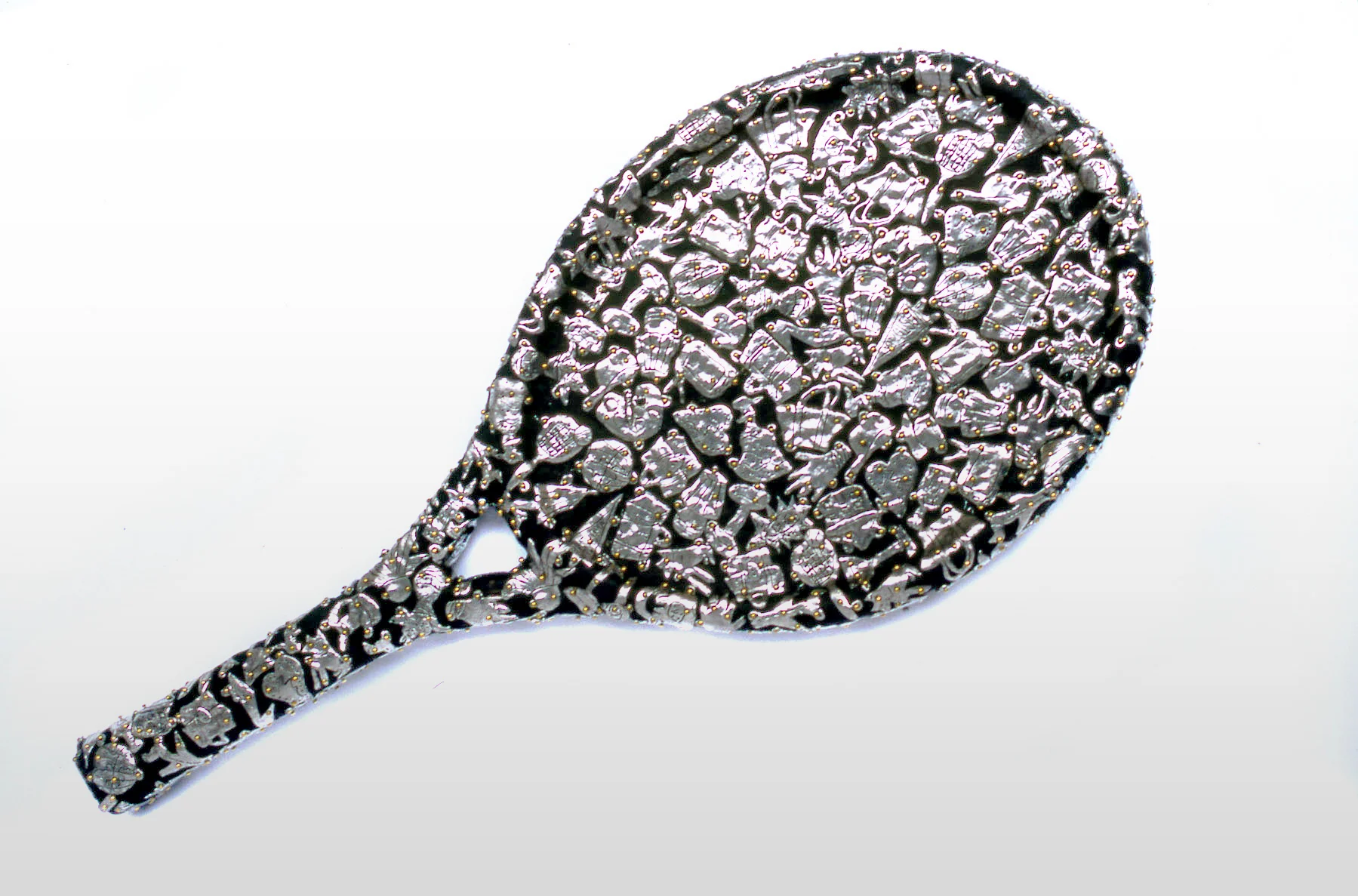 Claudia DeMonte (BIO), Female Fetish: Tennis Racket, 2005, pewter and brass on wood, 27" x 11" x 2"
