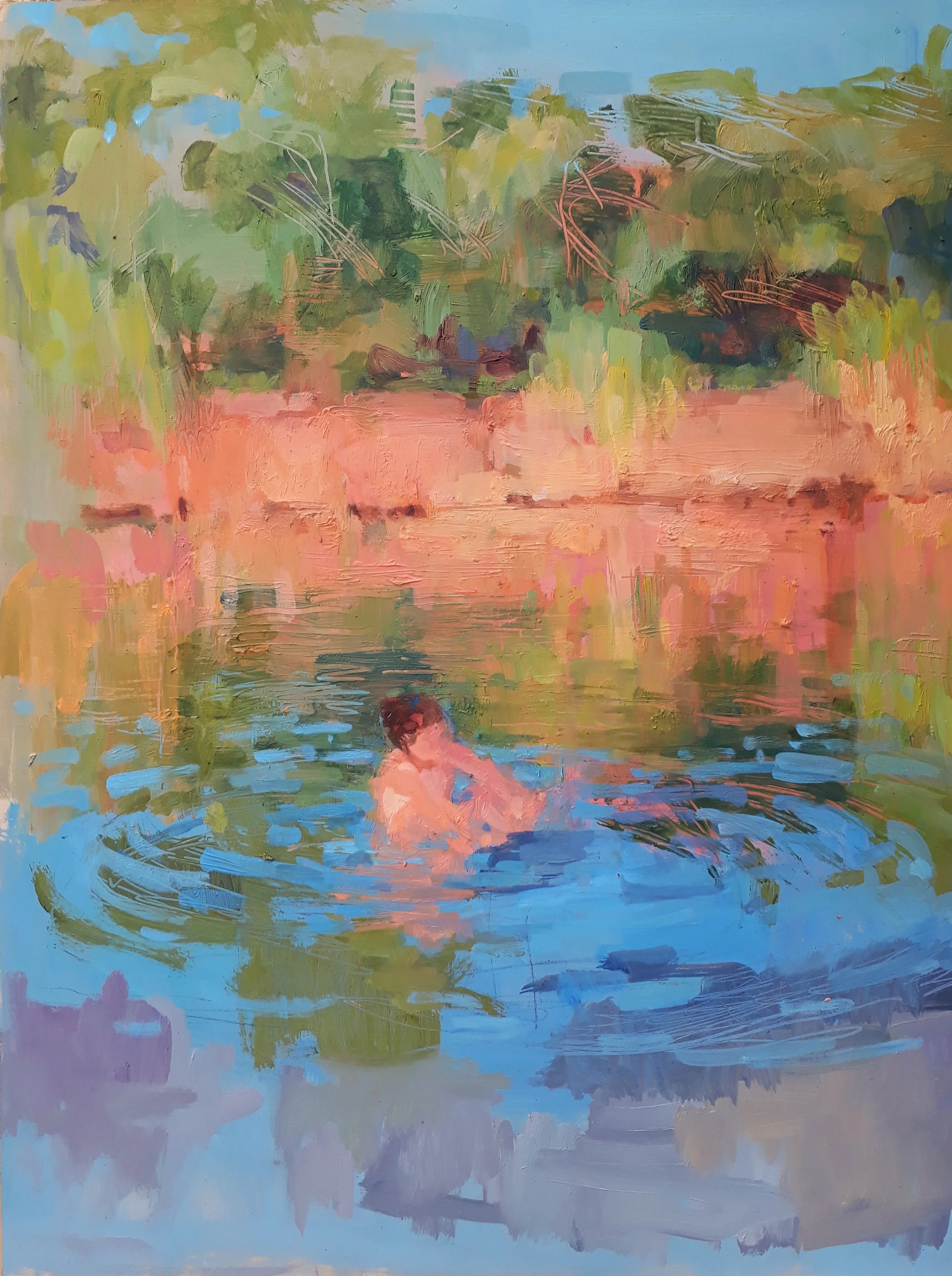 Paula Cecchi, “Sophie in the River 2,” 2021, oil on MDF, 17” x 13 1/8”