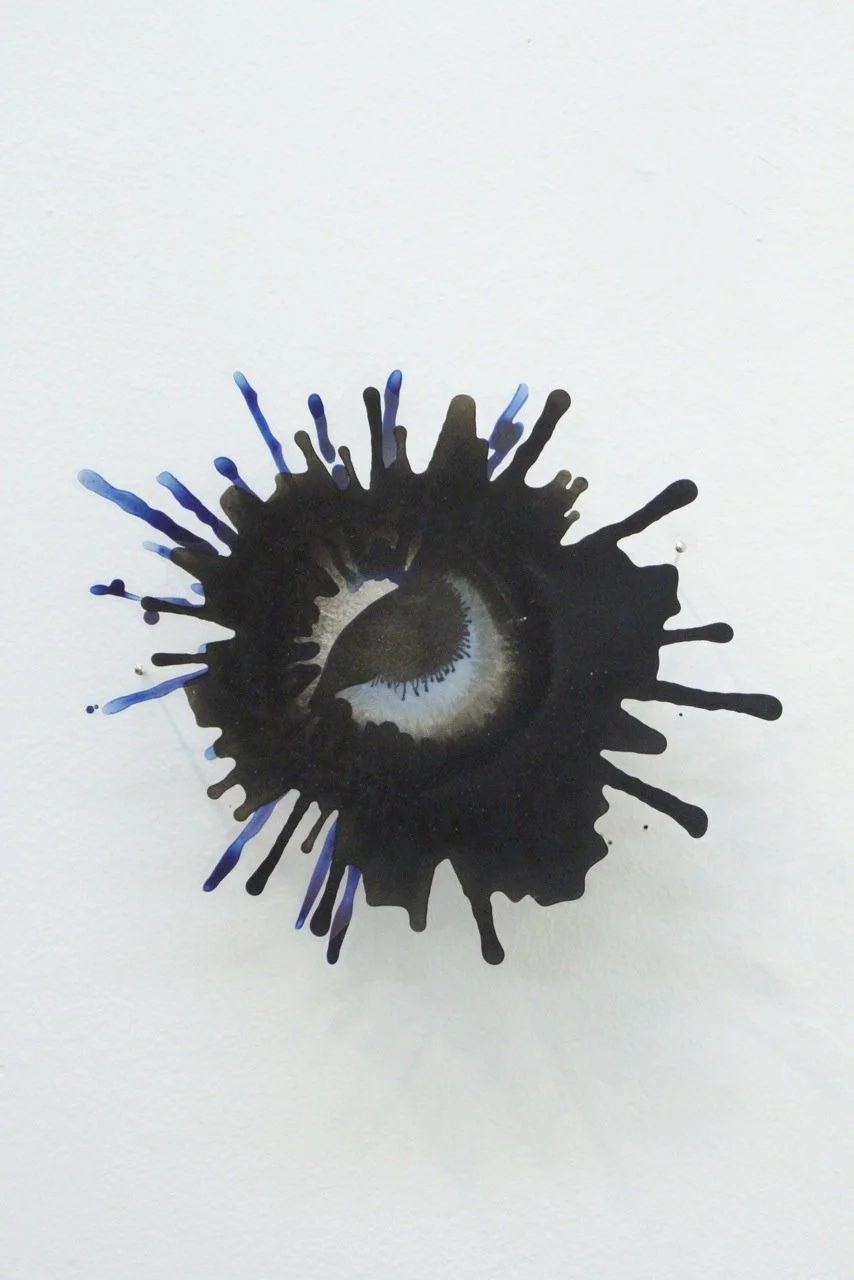 Katy Stone, “Other World (black iris),” 2015, acrylic on duralar, pins, 6” x 7”