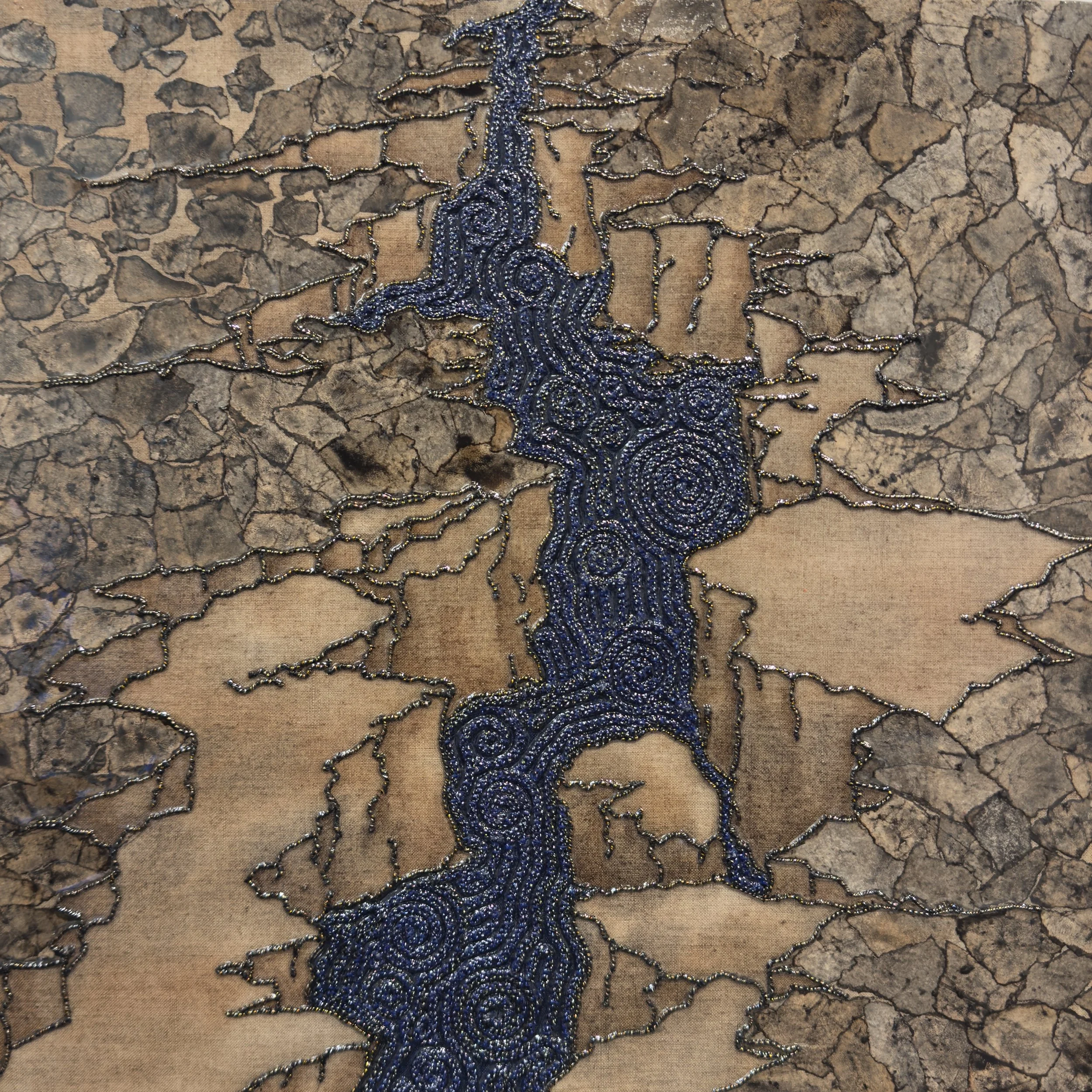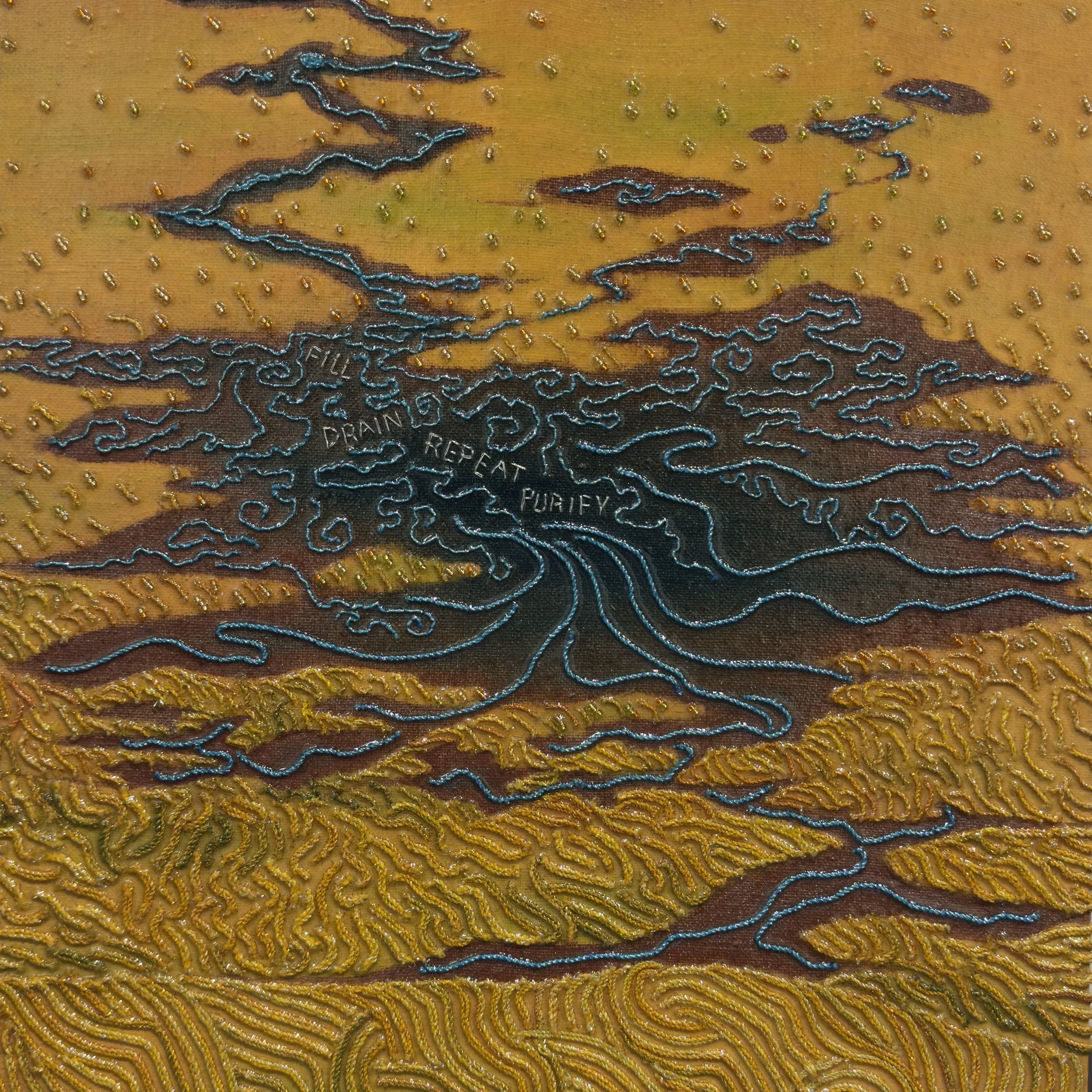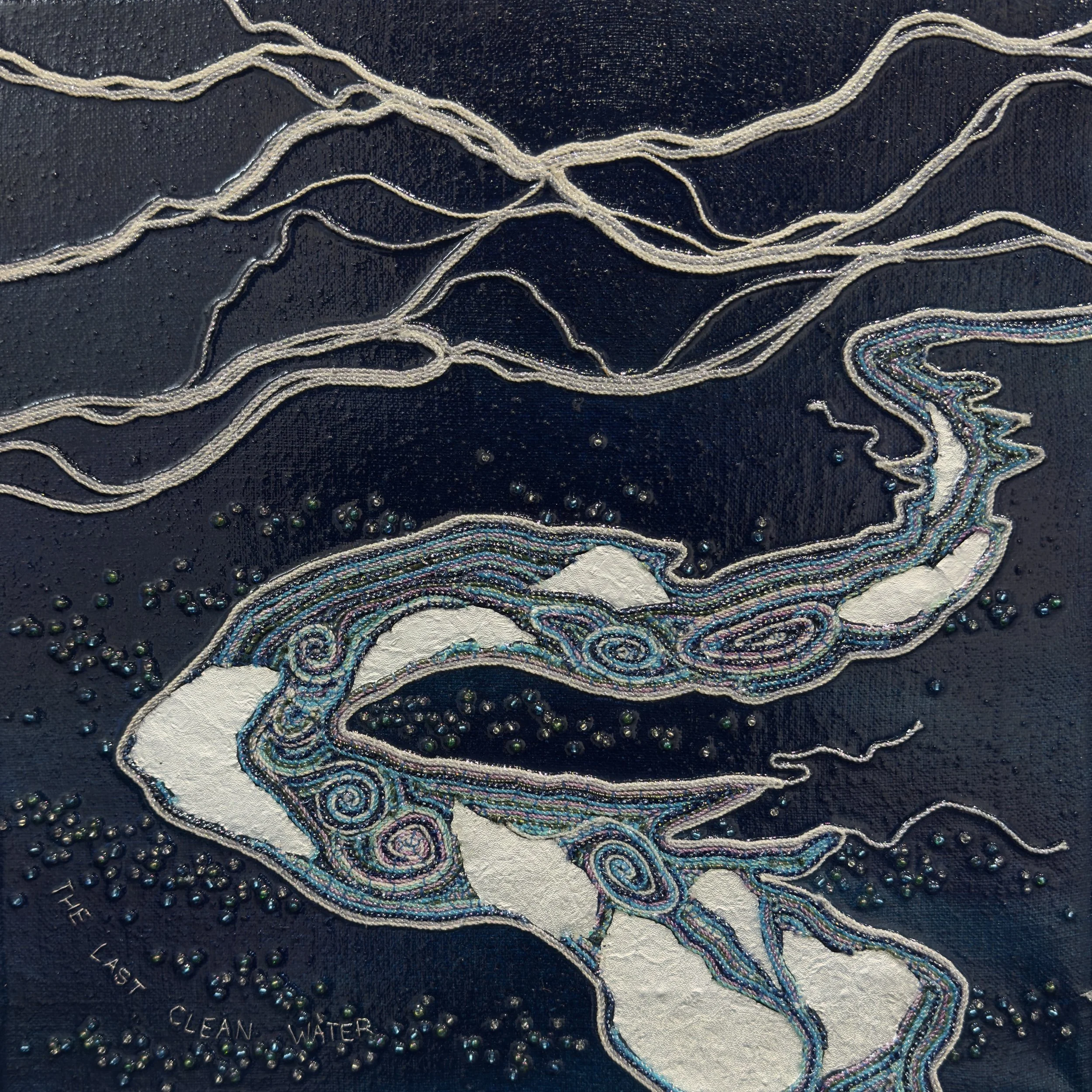 Leila Daw, "The Last Clean Water", 2024 acrylic, shwe chi doe tapestry, mixed media, 14" x 14"
