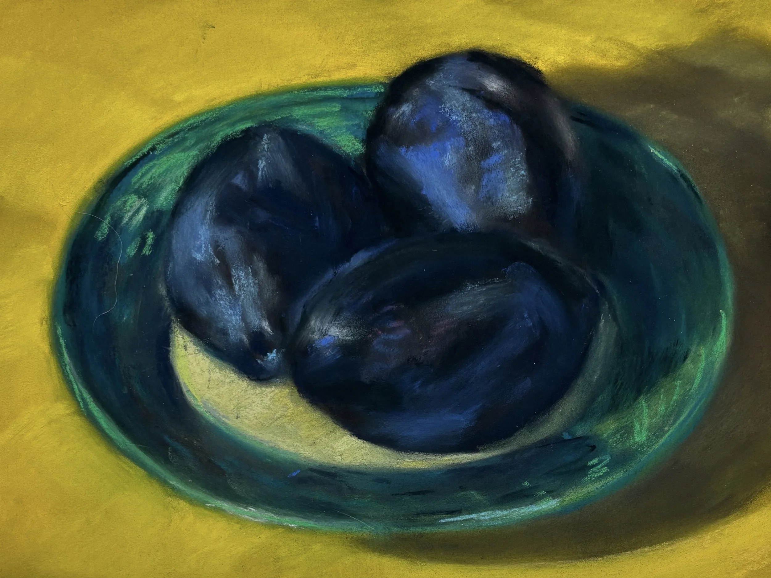 Mary Joan Waid, “Three Plums”, 2024 pastel on paper, 14” x 17”
